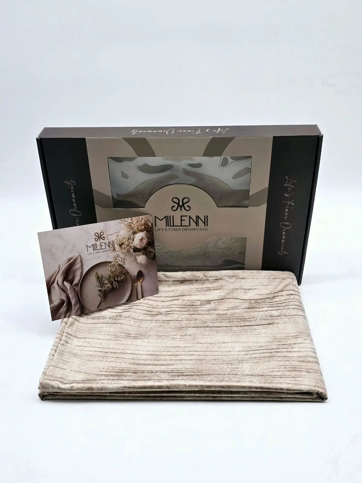 מפת שולחן יוקרתית מבית MILLENNI בעיצוב קלאסי ואלגנטי. המפה עשויה מבד איכותי בגוונים נטוראליים חמים עם פסי זהב עדינים הנותנים מגע של יוקרה ורוחב. מושלמת לאירוח חגיגי ויומיומי כאחד. זמינה באורכים 2.5, 3.5 ו-4.5 מטר ברוחב קבוע של 1.5 מטר. מגיעה באריזה מהודרת.