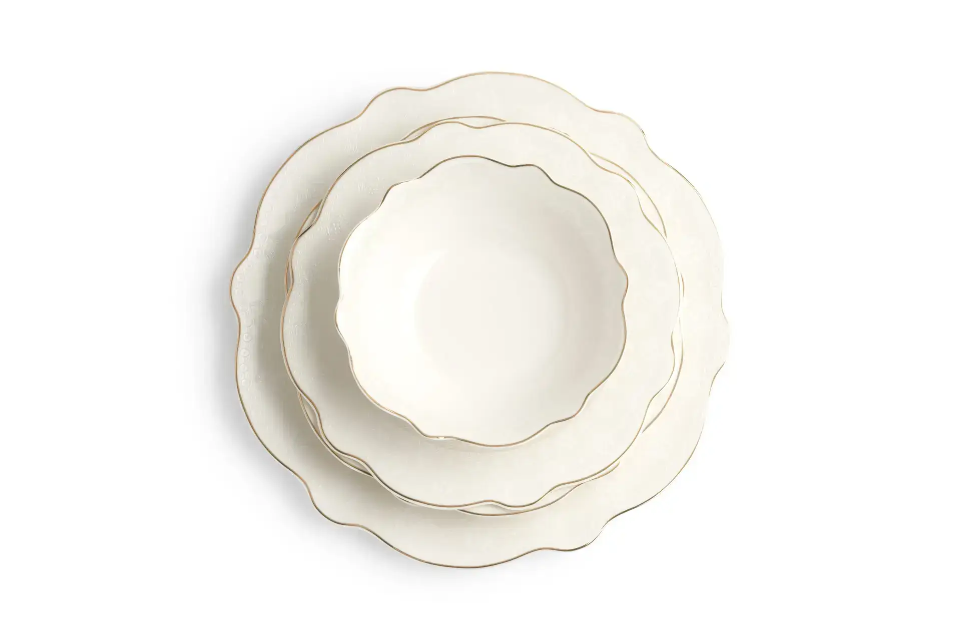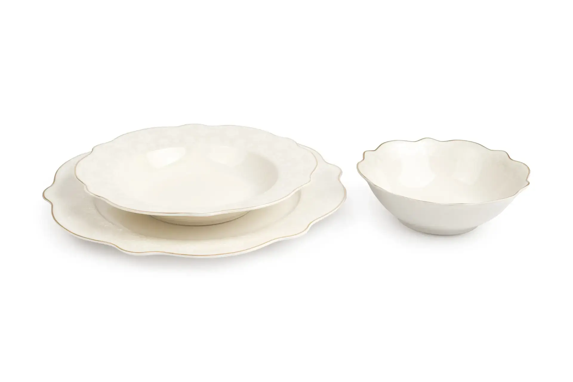 סט פורצלן 24 חלקים אלגנטי בעיצוב קלאסי עם קווים גליים רכים. כולל 6 מכל סוג כלי – צלחות גדולות וקטנות, קערות וכוסות. בגוון קרם עדין עם עיטור זהוב דק. איכות פורצלן גבוהה, מתאים לאירוח מיוחד ולשימוש יומיומי. קל לתחזוקה ובטוח למדיח כלים.